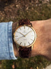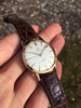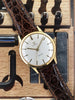 Case: 20 microns yellow gold-plated case with stainless steel back is approximately 33mm excluding the original signed Omega winding crown