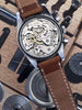 Strap: 19mm aged brown calf leather strap with hand-stitched sides; stainless steel tang buckle