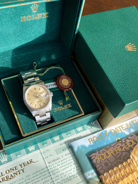 Other: The Rolex market is on absolute fire right now, but this gorgeous 36mm Datejust is proof that you can still get a great vintage Rolex watch at a relatively affordable price point. In simple terms, it's difficult to imagine a more reliable watch coming from any other brand (or a better place to park your cash for that matter). This reference 16220 is particularly striking and versatile with its 36mm stainless steel case, sharp engine-turned bezel, and silver sunburst dial that has developed a unique golden patina. The watch for sale here was presented to Dale Ballard on January 17, 1991 for his 25 years of loyal service to IBM (Quarter Century Club) as denoted on the caseback. These IBM award watches were ordered and delivered through retailer Michael C. Fina. This example comes complete with its original inner and outer Rolex boxes, paperwork, booklets, and both hang-tags. The outer Rolex box even confirms delivery to Dale Ballard. Also included with the watch is a service receipt from December 15, 2017 when the movement was overhauled with a new mainspring, auto-winding axel, case tube, gaskets and spring bars installed at the time of service. The original parts will be included with the watch.