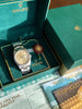 Features: Stunning original silver sunburst dial has aged to a unique and attractive golden hue with creamy Tritium lume plots; applied Rolex logo and beveled/polished hour markers; original matching Tritium hands; 36mm stainless steel Rolex Oyster case with sharp engine-turned bezel and sapphire crystal; original 78360 Rolex Oyster bracelet (fully linked); Rolex Chronometer-grade movement with quick-set date; IBM Quarter Century Club presentation watch complete with original boxes, papers, booklets, and hang-tags