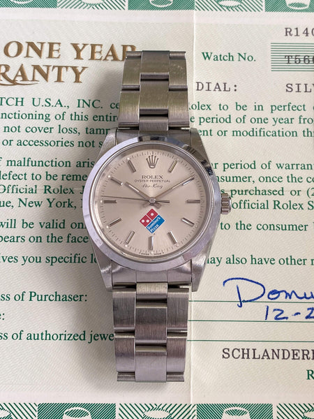 Model: Oyster Perpetual Air-King ref. 14000 "Domino's Pizza" Award Watch (Tritium Dial/Hands); Swiss Made; T-serial circa 1996 with original papers (dated 12-23-1996)