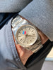 Features: Stunning original silver sunburst dial with vibrant Domino's Pizza logo and full Tritium lume plots; Tritium hands; 34mm stainless steel Rolex Oyster case with original presentation caseback engraving for Domino's Pizza award; original sapphire crystal and signed screw-down crown; original 78350 Rolex Oyster bracelet; original papers as acquired from the wife of the original owner