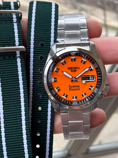 Model: Seiko 5 Sports x Rowing Blazers Collaboration ref. SRPJ57 (Orange Dial); Limited Edition of 888 pieces; circa October of 2022; Made in Japan