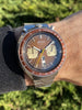 Features: Stunning original brown dial with white "SEIKO" logo and brushed gold sub-registers; matching day-date display at 6 o'clock with red "Sunday" text (can choose between English or Spanish days of the week); chronograph minute totalizer at 3 o'clock; 12-hour totalizer at 9 o'clock; original luminous hour and minute hands; original chronograph register hands; unpolished stainless steel case with beautiful brown tachymeter bezel and new tempered mineral glass crystal; desirable original Seiko "Fishbone" bracelet; in-house Seiko 6138 column-wheel chronograph movement (serviced)