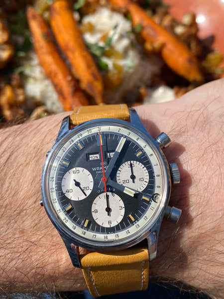 Other: We absolutely love this Wakmann Triple Date Chronograph and believe that it is one of the most undervalued vintage watches on the market today. This is most likely the best example that we've ever offered for sale (and we've sold many). The yellow lume is absolutely amazing as is the clean and vibrant reverse-panda dial. It is powered by a high-grade movement based on the legendary Valjoux 72, but with triple calendar functions and a higher beat rate (21,600 BPH) for improved accuracy. The 37mm stainless steel case wears extremely well on the wrist, which comes as no surprise given that it's the same size as a manual-winding vintage Rolex Daytona. It's also extremely versatile and can be dressed up or down making it difficult to beat if you've got a somewhat modest budget.