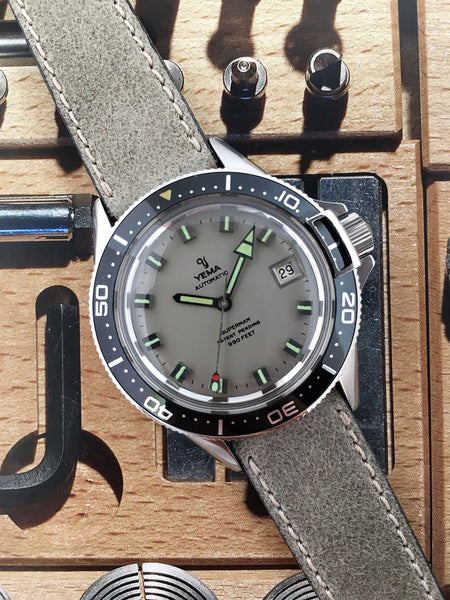 Other: Collector-grade vintage Yema Superman Diver watches don't come up for sale often, so we jumped at the opportunity to acquire this rare grey-dial variation in nearly unworn condition. This incredible example came from a gentleman that inherited a collection of vintage watches with this being among the very best. Just look at how crisp it is all around! We love the brushed metallic grey dial and how it catches the light. The raised block hour makers and domed acrylic crystal give it a 3-dimensional appearance that simply cannot be replicated on modern pieces today. The retro handset is super cool and unique - How about that "stoplight" sweeping-seconds hand? The bezel insert is so mint and shiny that it almost looks ceramic. The trademark bezel-locking mechanism prevents accidental rotation and proves that this dive watch was ahead of its time. With a large straight-lug case with massive crown guards and the perfect strap pairing from our friends at HODINKEE, what more could you want in a vintage diver watch for under 2 grand?