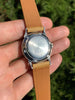 Strap: 18mm handmade tan calfskin strap with matching stitching and polished stainless steel tang buckle