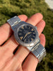 Features: Stunning original glossy black "SWISS" only dial with incredible yellow patina to the hour markers; original full-lumed hands with matching yellow patina; original metal rotating diver bezel displays elapsed time and can also be used in count-down applications; 35mm unpolished stainless steel case with correct 20 ATM. caseback and Zodiac domed acrylic crystal; excellent original Zodiac rivet bracelet with tight expandable spring-loaded links; rare and desirable early Zodiac Sea Wolf model 699