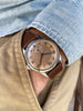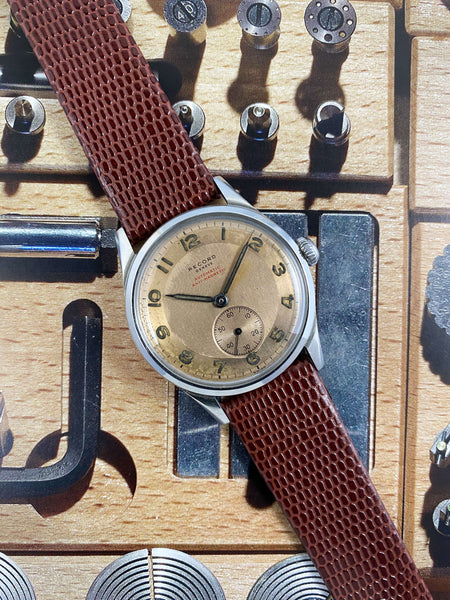 Other: This rare vintage Record watch is a great buy for well under $500. We love the metallic two-tone salmon dial with large luminous numerals and blued-steel hands. The red "AUTOMATIC" and "ANTI-MAGNETIC" lines of text on the dial add just the right amount of color to the classic 1950s look. This particular reference is powered by an in-house Record bumper automatic movement with sub-seconds register, a detail that we don't often see on contemporary watches. The brown lizard grain strap is a nice compliment and can be dressed up with a suit and tie or worn casually with a t-shirt and jeans.