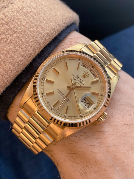 Features: Stunning original champagne dial with stick markers, applied Rolex coronet, and creamy Tritium lume plots; matching Tritium hands; 36mm solid 18K gold Rolex Oyster case with sharp fluted bezel; new factory Rolex double AR-coated sapphire crystal and gold Monoblock crown; original 18K gold Rolex "President" bracelet; Rolex Chronometer-grade movement with double quick-set day and date (serviced and under warranty); correct early date wheel with open 6/9