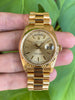 Condition: Fantastic original condition overall with minor honest wear consistent with age and use; 36mm 18K yellow gold case has been very lightly polished in the past but remains thick and even with its sharp original fluted bezel; crisp screw-down caseback; beautiful original champagne stick dial with all creamy Tritium lume plots present and in tact; excellent Tritium hands; very nice original gold Rolex president bracelet matches the overall condition of the watch and exhibits minimal stretch