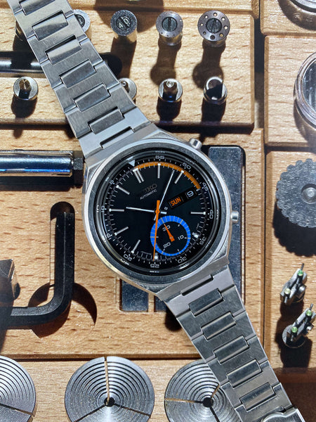 Other: This vintage Seiko Speed-Timer is the definition of cool - How did Seiko pack so many features into one watch while retaining such a balanced and appealing design aesthetic? We love how the blacked out day-date display blends into the matte black dial, and the vibrant colors really pop! The day of the week can be displayed in English or Spanish and Sunday is shown in red. Seiko opted for bright orangish-red chronograph hands on this model for increased legibility and it all just works so well. This particular Speed-Timer comes in superb original condition on its rare original Seiko bracelet and is ready to pair with your Japanese sports car (i.e. a Honda S2000 in Berlina Black).