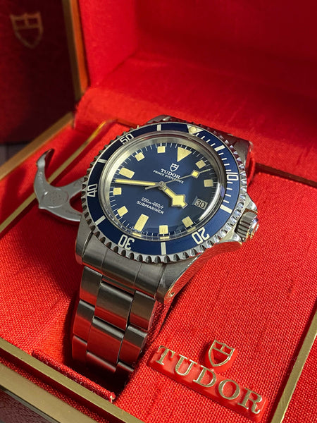Other: If you've been looking for a top-quality vintage Tudor "Snowflake" Submariner, this is the watch! It comes in collector-grade condition with an absolutely gorgeous original matte blue dial and matching original blue bezel insert. The Tritium lume is spectacular all around and has aged to a pleasing shade of yellow on the dial and original "Snowflake" hands - it really explodes in the sun! We are absolutely thrilled to offer this watch from Justin's private collection. It was owned by a very prominent and well-known collector before him. We love the D19 Superdome crystal without the cyclops over the date window. You can buy a comparable vintage Rolex Submariner in this price range, but that will be a much more common watch and it won't have a blue dial and blue bezel insert with unique "Snowflake" hands. Rolex actually never made a stainless steel Submariner with a blue dial... Simply put, this Tudor is a much more interesting watch for the money. As a bonus, it comes with rare inner and outer Tudor boxes and Tudor anchor.